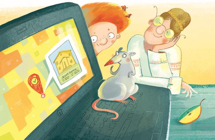 Дзынь откинул крышку ноутбука, достал из кармана мышку и выпустил её на стол. Мышка пробежалась по клавиатуре – на покрытом квадратиками экране появился синий кружочек. Мышка стукнула по самой большой клавише хвостом – кружок превратился в картинку. На ней красовалось двухэтажное, жёлтого кирпича строение с табличкой «Дом быта» над окнами.