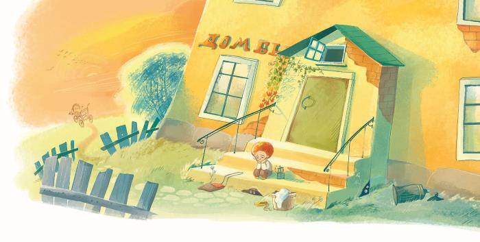 Дом номер семнадцать оказался хоть и не новым, но крепким, в два этажа. Цвета спелой тыквы! С зелёной крышей! У Ома дыхание перехватило. Домовёнок сдал экзамен по цветоведению на «отлично» и хорошо знал, что лучшего цвета для дома и желать нельзя. А когда он увидел над окном вывеску, даже присвистнул. Буквы на вывеске были яркие, апельсиновые и, должно быть, светились в темноте. Ом о таком даже не мечтал. Дзынь! – и вот он уже хозяин «Дома быта». Осталось только заселиться!