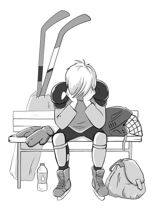 Так Саша вновь очутился на любимом стадионе… А тут как раз игра! А он сидит с запасными. Самым последним. Потому что столько времени пропустил, не занимался, и теперь тренер не выпускает его на лёд. Первый период уже заканчивается… Пошёл второй… Игра идёт; вот и второй период на исходе… А Сашу всё не выпускают. И не выпустят, уже наверняка не выпустят – вообще!