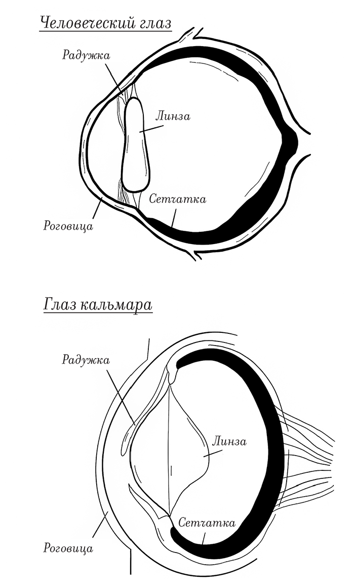 Возможно, самый удивительный и наиболее часто упоминаемый пример конвергентной эволюции – глаз камерного типа. Такой глаз – которым, среди прочих видов, обладаем и мы, – состоит из нескольких элементов: внешней прозрачной оболочки, способной отражать свет; линзы, способной к переменному фокусированию света; диафрагмы, диаметр которой подгоняется под уровень яркости, а также мышц, которые движутся в точной гармонии с мышцами другого глаза и мгновенно приспосабливаются к тонкой настройке гироскопа внутреннего уха. Ученые Пол Блум и Стивен Пинкер писали: «Чрезвычайно маловероятно, что материя может образовывать структуры, способные на то, на что способен глаз»[49]. И все же в результате эволюции глаз камерного типа развился у шести (если не больше) представителей различных видов, в том числе у группы морских животных, являющихся близкими родственниками дождевых червей[50]. У кальмара тоже есть камерный глаз, развившийся независимо и поразительно похожий на наш (рис. 2.4).