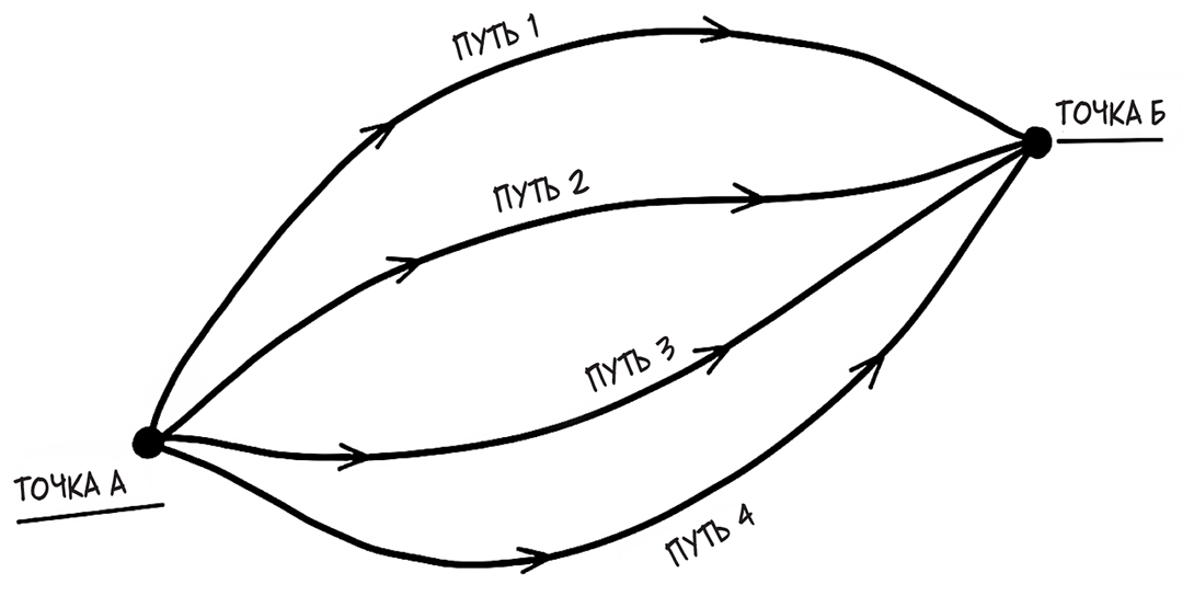 Рис. 2.5. Четыре пути, сходящиеся в одной точке