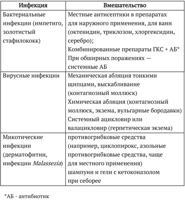 Пациентам с инфекционными осложнениями атопического дерматита необходимо продолжать использовать тГКС. Не противопоказано использование стероидов на фоне антибиотиков системного действия или местных антимикробных средств (при меньшей выраженности инфекции). Рационально в случае мокнутий применять соответствующую состоянию кожи лекарственную форму глюкокортикостероида – лосьон, затем крем, но не мазь (во избежание нежелательной окклюзии, способной усилить инфекционный процесс). Использование ТИК в таких ситуациях категорически не допускается. Лечение кремом ТИК можно проводить только после устранения инфекционных осложнений.
