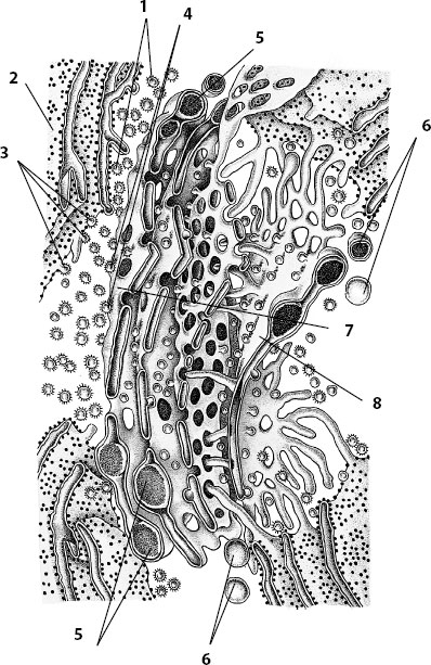 1 – транспортные пузырьки; 2 – цистерна гранулярной ЭПС; 3 – транспортные пузырьки, отпочковывающиеся от гранулярной ЭПС; 4 – слияние транспортного пузырька с формирующейся поверхностью комплекса Гольджи; 5 – конденсирующие вакуоли; 6 – пузырьки, отщепляющиеся от комплекса Гольджи; 7 – формирующаяся поверхность комплекса Гольджи; 8 – зрелая поверхность комплекса Гольджи