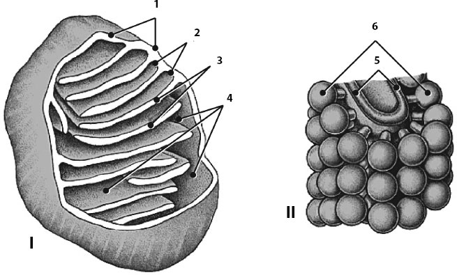 I – общая схема строения: 1 – наружная мембрана; 2 – внутренняя мембрана; 3 – кристы; 4 – матрикс; II – схема строения кристы: 5 – складка внутренней мембраны; 6 – грибовидные тельца