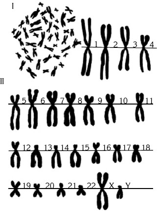 В соматических клетках имеются по две копии каждой хромосомы, их называют гомологичными. Они одинаковы по длине, форме, строению, расположению полос и несут одни и те же гены, которые локализованы одинаково. Нормальный кариотип человека (от греч. karyon – «ядро ореха», typos – «образец») включает 22 пары аутосом и одну пару половых хромосом (ХХ женщины или XV мужчины) (рис. 13).