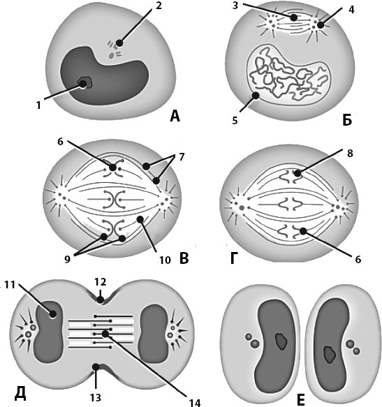 А – интерфаза; Б – профаза; В – метафаза; Г – анафаза; Д – телофаза; Е – поздняя телофаза; 1 – ядрышко, 2 – центриоли; 3 – веретено деления; 4 – звезда; 5 – ядерная оболочка; 6 – кинетохор; 7 – непрерывные микротрубочки; 8, 9 – хромосомы; 10 – хромосомные микротрубочки; 11 – формирование ядра; 12 – борозда дробления; 13 – пучок актиновых нитей; 14 – остаточное (срединное) тельце