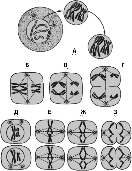 А – протофаза I; Б – метафаза I; В – анафаза I; Г – телофаза I; Д – профаза II; Е – метафаза II, Ж – анафаза II, З – телофаза II