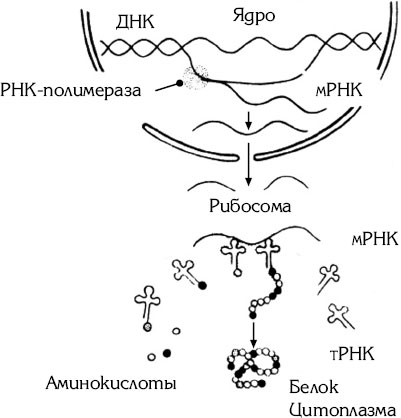 Синтез белка (трансляция) связан с процессом транскрипции переписывания информации, хранящейся в ДНК. Информация о структуре белка, заключенная в ДНК, «переписывается» на информационную, или мессенджер (от англ. messenger – «посредник») РНК (мРНК).