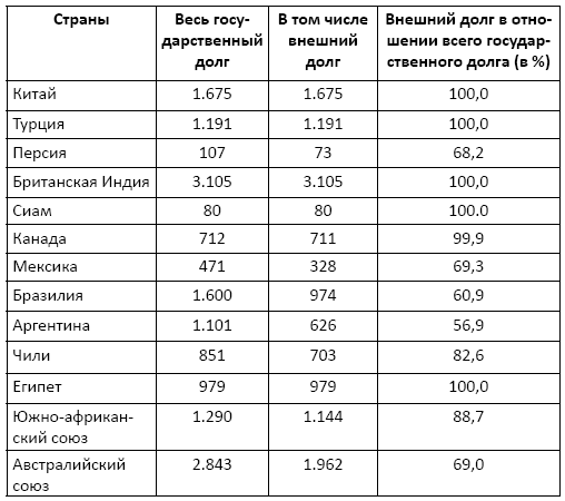 Так, например, при государственном долге царской России накануне империалистической войны в размере 8,8 млрд. руб. – 4,2 млрд. руб. падает на внешнюю задолженность. Из общей суммы задолженности Венгрии в 2,5 млрд. руб. около 1,5 млрд, падает на внешние долги; в Румынии – при государственном долге в 650 млн. руб. к свыше 500 млн. руб. приходится на внешний долг; в Греции внешний долг составляет 270 млн. руб. при общем размере государственного долга в 330 млн. руб.; в Болгарии – 200 млн. из 350 млн. Задолженность внеевропейских стран, как это видно из таблицы («Гос. долг…»), почти исключительно внешней.