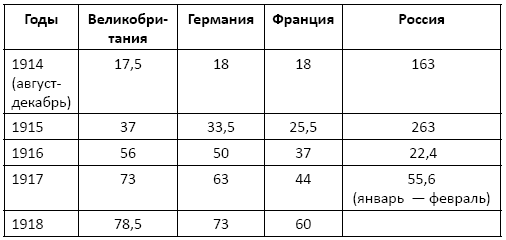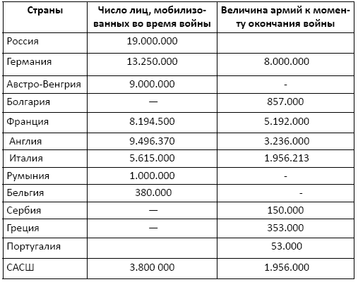 Империалистическая война 1914–1918 гг. потребовала от воевавших государств такого напряжения, которое неизмеримо превосходит все то, что нам известно из истории прошлых войн. О размере армий воевавших стран дает представление следующая таблица: