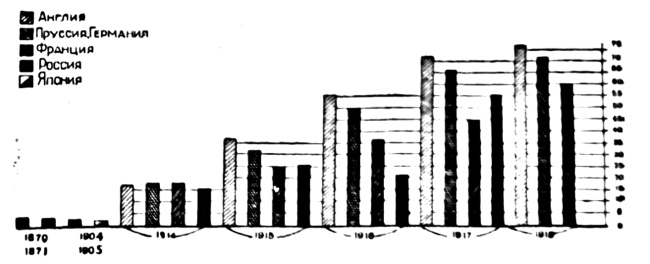 Стоимость империалистической войны 1914–1918 гг. во много раз превышает стоимость предыдущих войн. Это обнаруживается при сопоставлении военных издержек отдельных государств за день в предыдущие войны и в период империалистической войны. Во время франко-прусской войн 1870–1871 гг. Пруссия тратила ежедневно 3,9 млн. руб., а Франция – 4,2 млн. руб. Во время русско-японской войны 1904–1905 гг. Япония тратила ежедневно 2,2 млн. руб., а Россия – 2,6 млн. руб. Ниже мы приводим данные о том, во. что обходился каждый день войны 1914–1918 гг. царской России, Великобритании, Германии и Франции.