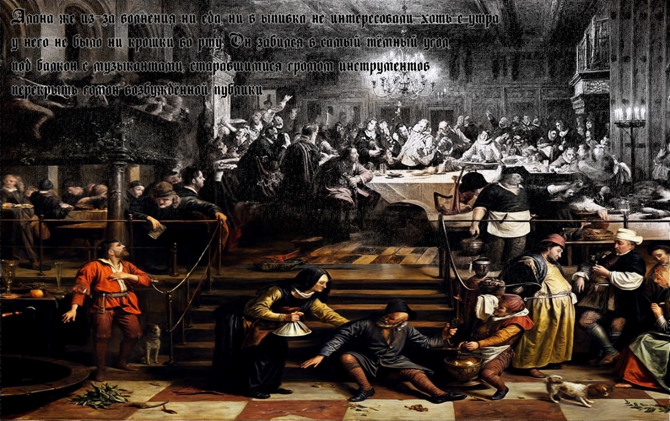 Алана же из-за волнения ни еда, ни выпивка не интересовали, хоть с утра у него не было ни крошки во рту. Он забился в самый тёмный угол, под балкон с музыкантами, старавшимися громом инструментов перекрыть гомон возбуждённой публики. Здесь с Аланом даже никто не думал заговаривать – настолько оглушительной была музыка.