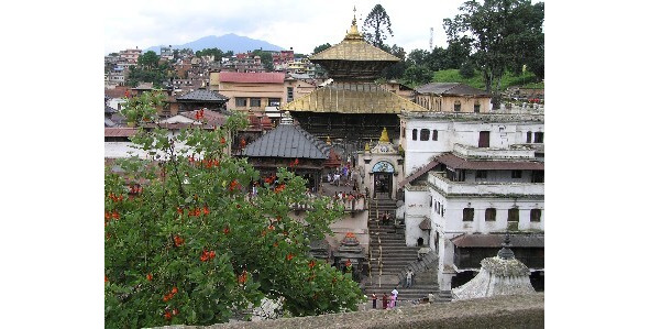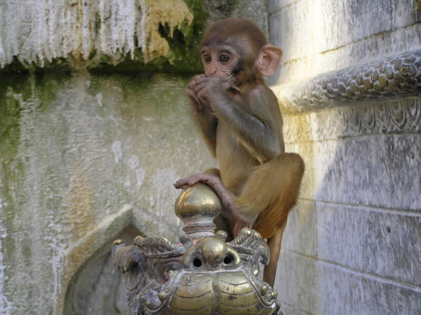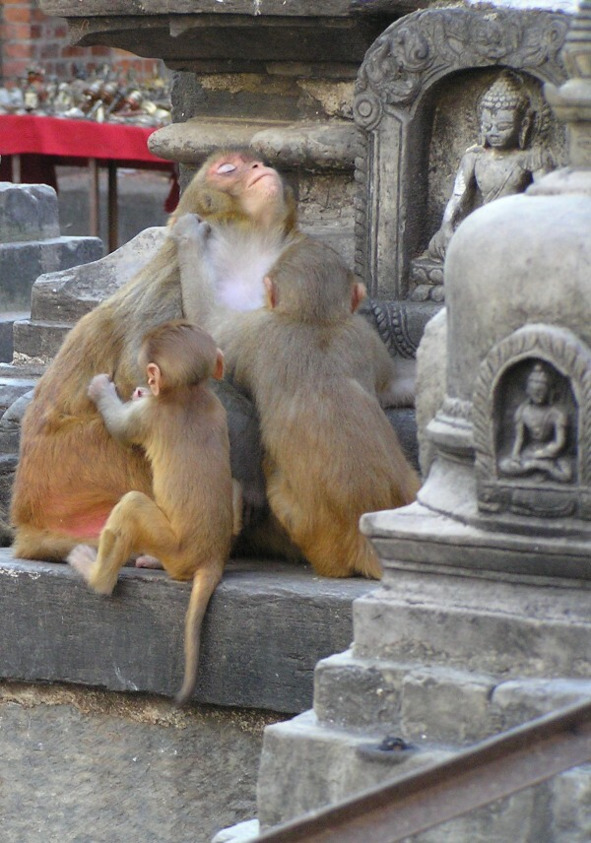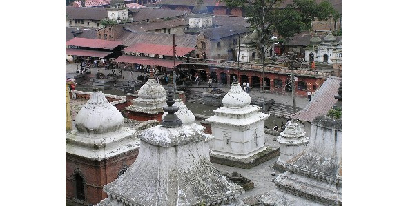 Тут же во внутреннем дворике разложены результаты жертвоприношений (это при жаре около тридцати градусов), источающими соответствующий аромат, вперемешку с какими-то растениями. Один из местных постоянно что-то перекладывал, перемешивал, переставлял посуду, в которой это всё находилось. Стены дворца тёмного, почти чёрного цвета, из дерева и украшены всевозможными фигурками из того же дерева, а иногда просто вырезаны в нём. Печать времени чувствуется на всём – от мостовой до стен и резных окон. На площади в одном из культовых сооружений в центре зала за невысокой перегородкой сидел медитирующий человек в позе лотоса. Вокруг него курились всевозможные благовония, а рядом на блюде разложены внутренности животных и различные растения. Он сидел неподвижно и кажется что-то проговаривал, едва шевеля губами. К нему подходили возможно местные, а может быть индусы и просили благословения. Мы вышли на свежий воздух и отправились фотографироваться на площади. Архитектура кругом необычная, привлекающая своими формами. Осмотрев все достопримечательности старой площади, переезжаем к индуистскому храму Шивы – Пашупатинатх на священной реке Багмати. Зрелище, конечно не для слабонервных. В этом месте находится ритуальная площадка для кремации. Можно наблюдать во всех подробностях эту процедуру, начиная от укладки умерших на стол для кремации и до сбрасывания сгоревших останков в священную реку. Мы наблюдали данный процесс (кое кто даже снимал на камеру и фото), находясь на другом берегу реки. Правда ширина её всего 20—30 м. Кремацию производят практически весь день, так что окрестные районы обильно застилает дым характерного запаха. Но это всё мы наблюдали несколько позже, а вначале познакомились с местными хвостатыми обитателями комплекса – обезьянами, которые свободно разгуливали между деревьев и ступ, не обращая на нас никакого внимания.
