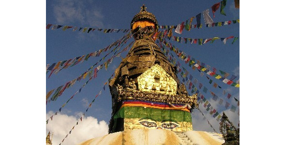 Пашупатинатх – это целый комплекс ритуальных сооружений своего назначения. Площадка для кремации занимает в нём весьма незначительную часть. Остальное это храмы, ступы, мосты, парк. Если подняться наверх, на возвышенность, то можно увидеть множество отдыхающего народу, который просто расположился на траве или играет в спортивные игры. Не смотря ни на что, жизнь продолжается. А мы продолжаем запланированные экскурсии по святым местам Катманду. На этот раз ступа Будданатх, возле которой расположены монастыри тибетского буддизма. Поражает своей монументальностью. Возможно это самая большая ступа в мире. Множество народу: и паломников, и туристов. У подножия ступы, по периметру, барабаны, которые надо крутить при обходе. Приверженцы буддизма обходят по часовой стрелке, последователи религии Бон – против часовой стрелки. Купол покрыт интересным составом салатного цвета – напоминает натёки сталактитов в карстовых пещерах. Где-то около 12.00 лёгкий ланч в кафе на втором этаже с прекрасным видом на весь комплекс и ступу. В состав комплекса большой ступы входит также действующий монастырь. Первый раз воочию убедился, что монахами могут быть не только тибетцы – видел несколько монахов европейского вида. Вход в монастырь без обуви, которую оставляли на подставках перед входом. Характерный запах курящихся благовоний, которыми густо напоен воздух монастыря, не сравним ни с каким другим. В центре монастыря большая статуя Будды в окружении тибетских святых и всевозможных подношений. После ланча и небольшого отдыха отправляемся в район ступы Сваямбунатх. Эта экскурсия получилась, как добавка к программе на сегодняшний день, в частности и по моей просьбе. А просьба возникла не на пустом месте. Накануне вечером один из гидов предложил посещение ступы перенести на 25 сентября, в свободный день, перед вылетом в Москву. Но внезапно всплыла информация о том, что есть возможность заказать интересный тур – полёт над Гималаями. Это, в общем-то, отдельная экскурсия и сколько она займёт времени точно пока никто не знал. Приблизительно половину дня, а если будет сдвиг по погоде, то, возможно, растянется на день. Вот и возникла мысль все ступы посетить сегодня. А тем более мне так хотелось побывать именно на Сваямбунатхе, и воочию убедиться в происхождении выставленной ваджры – это действительно древний инструмент или же просто скульптура. Кроме того, интересно было бы посмотреть весь комплекс возле ступы и выяснить, в чем он так копирует комплекс пирамидальных образований Кайласа.