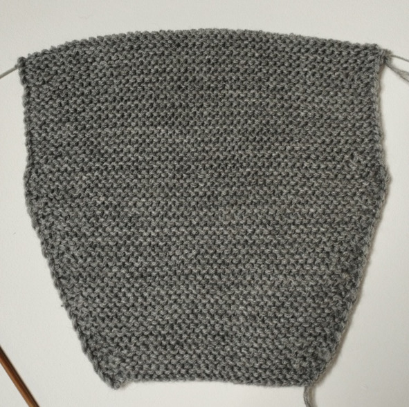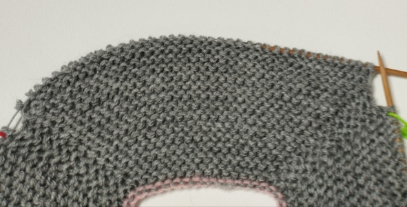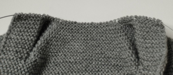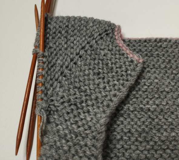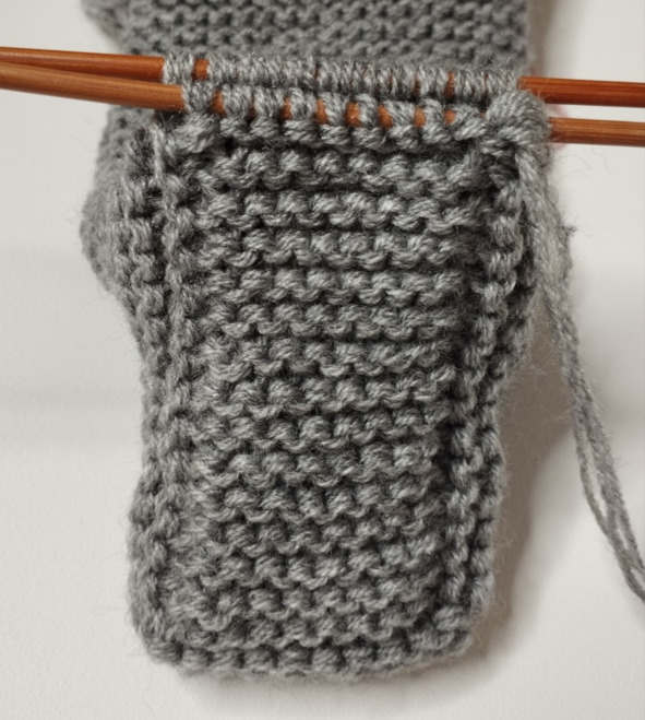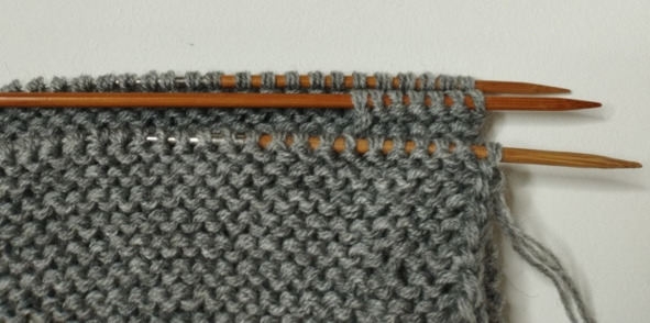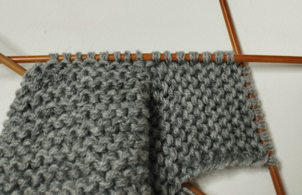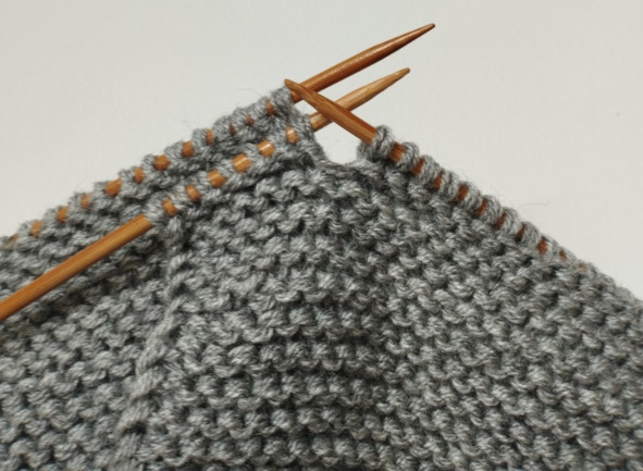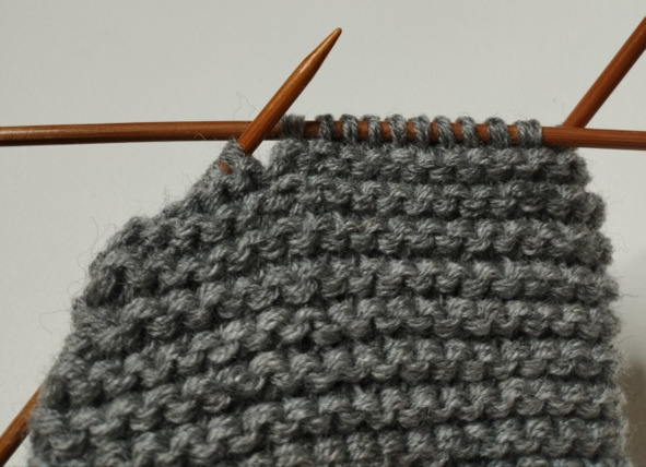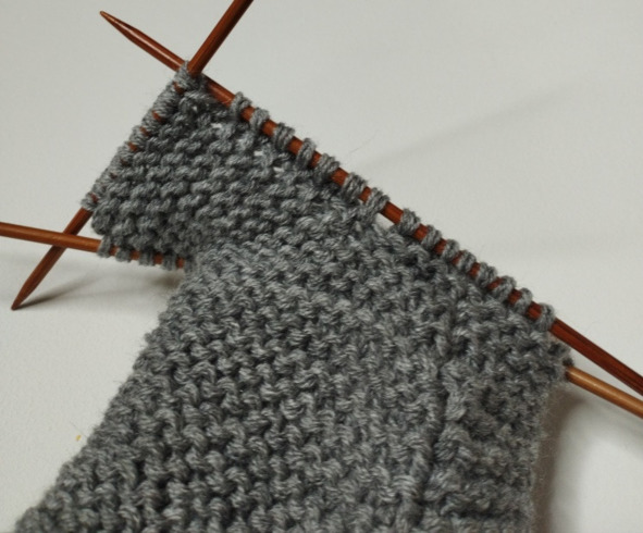 Далее будем вязать выступающую часть платочной вязкой только 10 петель с первой спицы:
