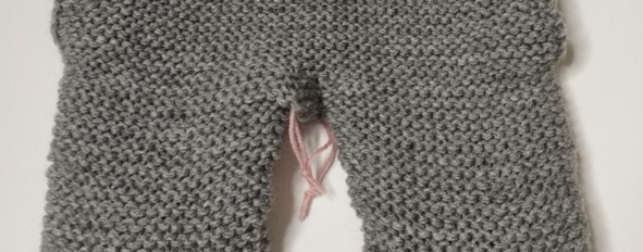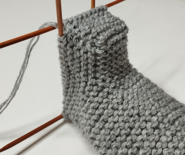 Затем вяжем 10 лицевых с третьей спицы (задняя часть пинетки)