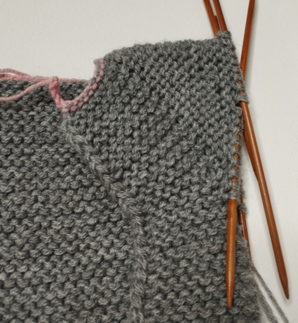 Затем снова кладем левую планку переда на левую планку задней части, 7 петель левой планки переда переснимем на запасную спицу, затем аналогично вяжем 7 раз по две вместе лицевой (одну петлю берем с левой планки переда, а другую с левой планки задней части), было 14 петель на двух планках, должно стать 7 петель,