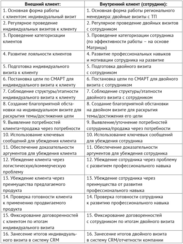 Я бы хотел целенаправленно обратить Ваше внимание на еще один важный и полезный инструмент для привлечения внимания сотрудников территориальных команд к проблемным навыкам в их подготовке. Это – сравнение/сопоставление между собой последовательности действий представителя в определенный момент беседы с клиентом и действий клиента в качестве реакции на поведение сотрудника. Такой анализ в форме вопросов представителю дают менеджеру очень хорошую возможность подвести своего сотрудника к несоответствию в словах и поведении клиента или его неадекватной реакции, которые и указывают на сделанные представителем ошибки на визите.