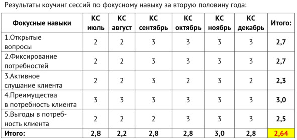 • Частота коучинг сессий с каждым сотрудником территориальной команды в полугодие = 7 коучинг сессий: 6 месяцев = 1,2 раза (чуть больше одного раза в месяц).