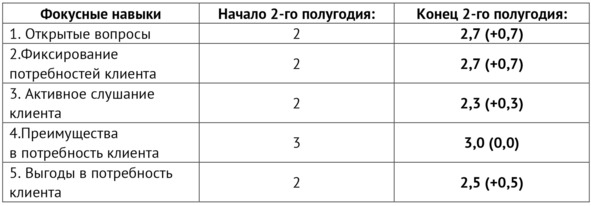• Действия: Выделение навыка №4 (Активное слушание) в качестве фокусного для отработки в первой половине года; помощь эксперта в команде по данному навыку и контроль менеджера в развитии фокусного навыка (=ФН); позитивная мотивация со стороны менеджера (фиксирование динамики развития ФН + возможность включения сотрудника в кадровый резерв по итогам полугодия).