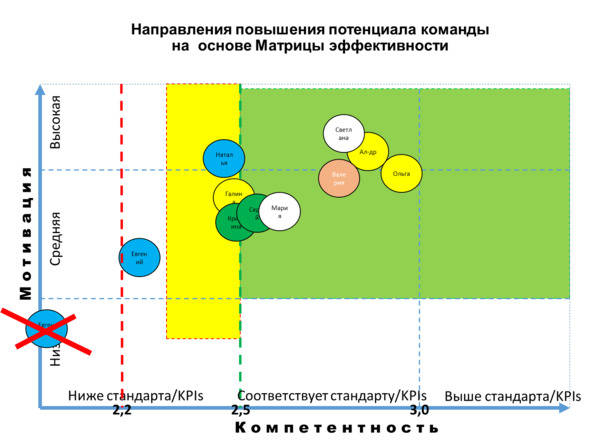 Действия: в ближайшие 3—4 месяца 60% сотрудников необходимо довести до уровня СООТВЕТСТВИЯ СТАНДАРТУ (=2,5); 100% сотрудников должны находиться на СРЕДНЕМ и ВЫСОКОМ уровне мотивации к решению поставленных задач; основное направление работы менеджера для реализации данных целей: а) ПОВЫШЕНИЕ КОМПЕТЕНТНОСТИ Наталья и Сергея; Сергея и Кристины, Галины и Марии; б) административные действия – возможное УВОЛЬНЕНИЕ Евгения; поддержка и повышение мотивации высоко-потенциальной части команды (40%).