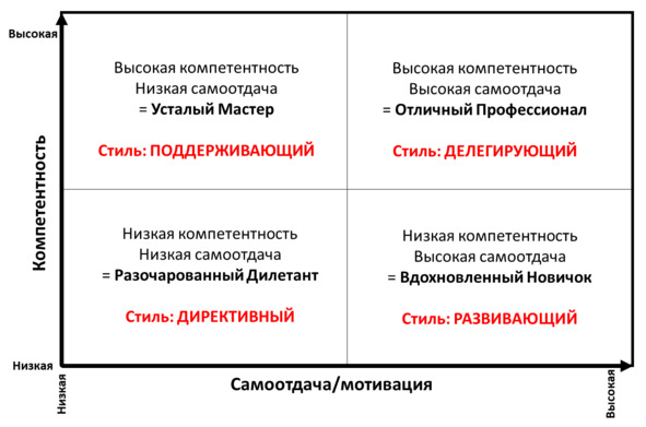 Таким образом, поддерживающий стиль (вместе с делегирующим, который также будет рассмотрен далее) направлен, главным образом на усиление МОТИВАЦИИ, а не компетентности подчиненного.