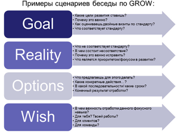 • в ходе беседы больше говорит сам менеджер (от 60 до 80% времени), чем его сотрудник;