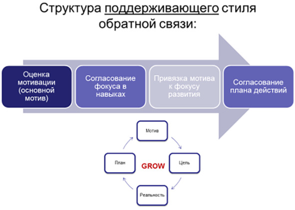Отличительной особенностью здесь будет перенос мотивационного компонента на первое место. Это обусловлено направленностью поддерживающего стиля на изменение мотивации сотрудника, что в данной ситуации имеет решающее значение для корректировки его поведения.