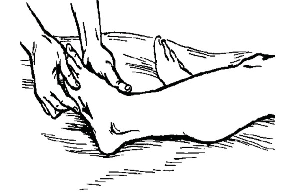 в голеностопном суставе – с бедра, затем массировать голень и только потом голе- ностопный сустав, все движения – по на- правлению к паховому лимфатическому узлу.