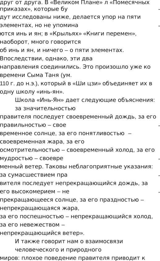 – этом и состоит вклад в китайскую мысль школы «инь-ян». Она представляет собой научную тенденцию в том смысле, что пыталась дать позитивную интерпретацию естественных событий исключительно в поня – тиях природных сил. Под «позитивным» мы подразумеваем имеющее дело