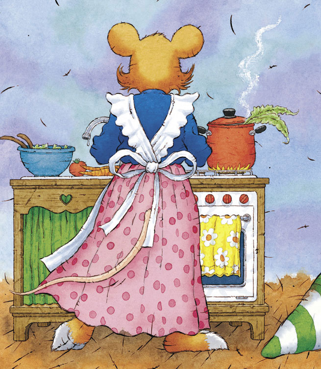 Мама готовит, а Тим рассматривает картинки в книжке.
