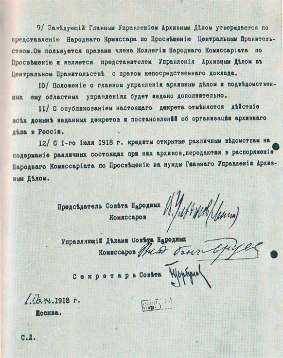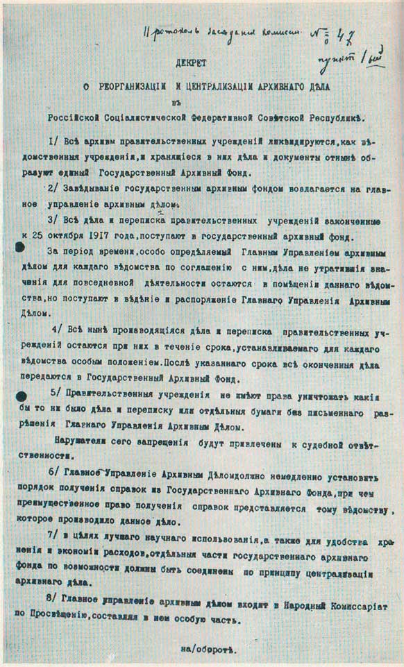 Так, первого июня 1918 года Совет Народных Комиссаров принял декрет «О реорганизации и централизации архивного дела в Российской Социалистической Федеративной Советской Республике» (представляем декрет [2]).