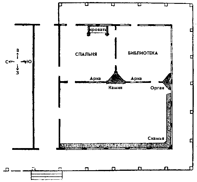 «Которая показывает план южной части дома. При входе в этот коридор первая дверь направо ведёт в главную комнату дома, в которой обычно сидит Владыка. Она большая и очень высокая, примерно 9 на 15 метров и во многих отношениях больше похожа на зал, чем на комнату, и занимает весь фасад дома по эту сторону коридора. За этой большой комнатой находятся две почти квадратные комнаты: одну из которых он использует как библиотеку, другую – как спальню. Этим заканчивается эта сторона дома, по-видимому, предназначенная для личного пользования Учителя, и она окружена широкой верандой. Другая сторона дома по левую сторону коридора, по-видимому, разделена на много меньших комнат и различных служебных помещений, но у нас не было случая близко познакомиться с ними, однако, напротив выхода из спальни мы заметили хорошо устроенную ванную.