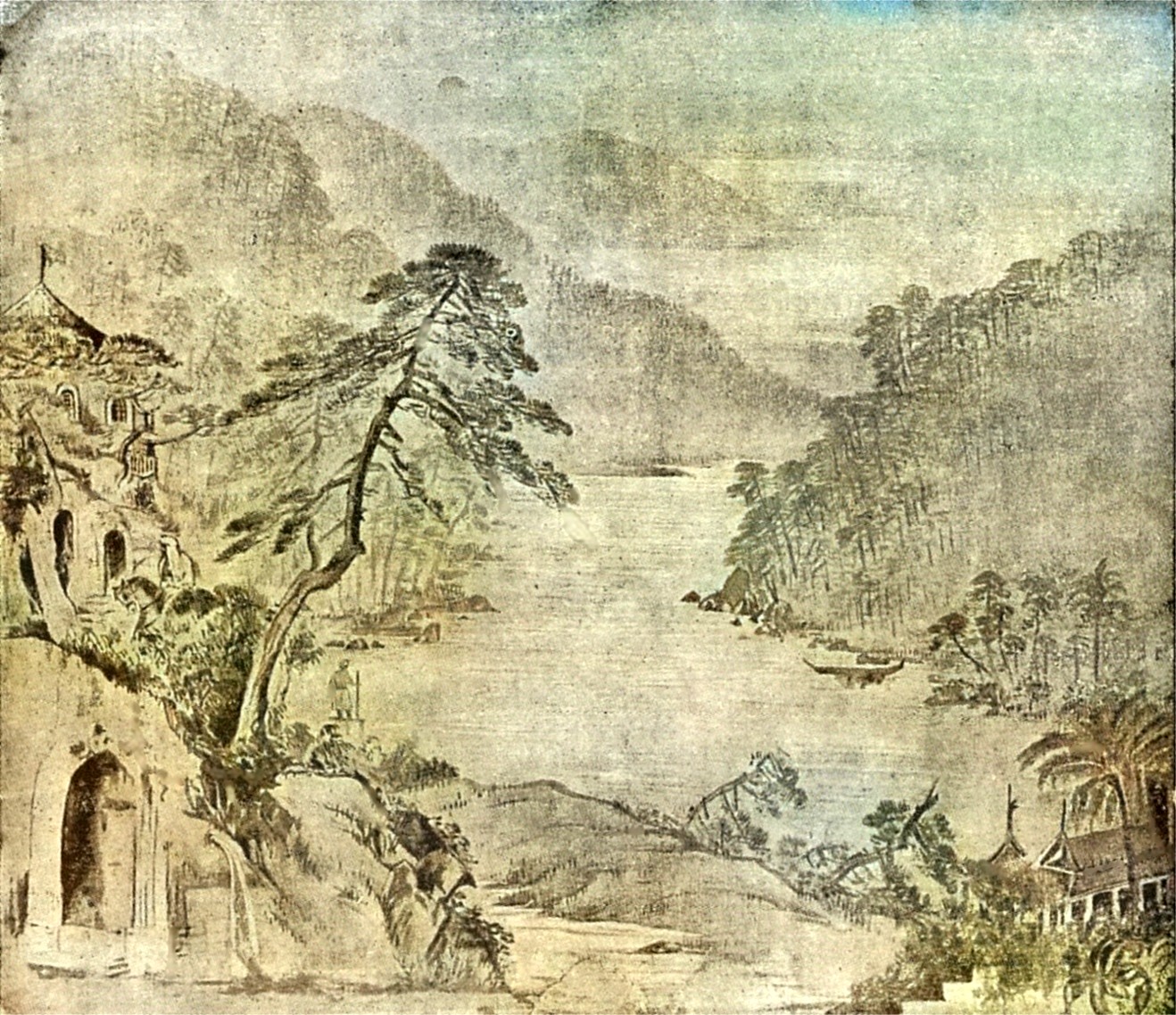 «Оригинал выполнен на шёлке и хранится в алтарной комнате штаб-квартиры Теософского Общества, в Адьяре. Слева, возле двери своего дома, изображён сидящий верхом на лошади учитель Мория. Обитель Учителя Кут Хуми не видно на рисунке, поскольку находится выше в долине за поворотом направо. Блаватская попросила Учителя Джуал Кхула, чтобы он и себя изобразил на этой картине. Поначалу он отказался, потом добавил себя в виде небольшой фигуры, стоящей в воде и хватающей шест, обращённый спиной к наблюдателю! Оригинал бледно-окрашен, тона его голубые, зелёные и чёрные. На нём есть и подпись художника – псевдоним Гай Бен-Джамин, который он носил в пору своей юности в ранние дни Теософского Общества, задолго до того, как достиг адептства. По всей видимости, сцена запечатлена в начале дня, поскольку утренний туман ещё цепляется за склоны холмов. Учителя Мория и Кут Хуми занимают дома на противоположных сторонах этого узкого ущелья».