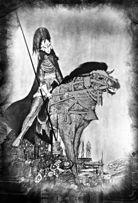Но в то время как происходила суматоха, вызванная пожаром, сам молодой владетель, по-видимому погруженный в глубокие размышления, сидел в одном из обширных и пустынных верхних покоев фамильного дворца Метценгерштейн. Богатая, хотя и поблекшая обивка, угрюмо висевшая на стенах, изображала призрачные и величественные фигуры множества знаменитых предков. Здесь священники и высшие духовные особы, разукрашенные горностаями, сидят запросто с самодержцем и сувереном, накладывают вето на желание мирского короля, или именем верховной власти папы обуздывают мятежные замыслы Архидьявола. Там высокие стройные фигуры князей Метценгерштейнов – их мускулистые боевые кони, попирающие трупы павших врагов – заставляли трепетать самые сильные нервы своей могучей выразительностью; и здесь опять сладострастные фигуры дам давно прошедших дней, точно белоснежные лебеди, проплывали в лабиринте фантастических танцев под струны воображаемой музыки.