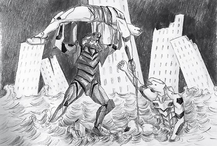 Ева-01 выхватил свой прогрессивный нож и приготовился бежать навстречу копиям ангелов, но едва он сделал пару шагов, как на него обрушилась огромная масса. Ангелы подбросили Еву-02 в воздух. Оба Евангелиона столкнулись друг с другом и тяжело упали на землю.