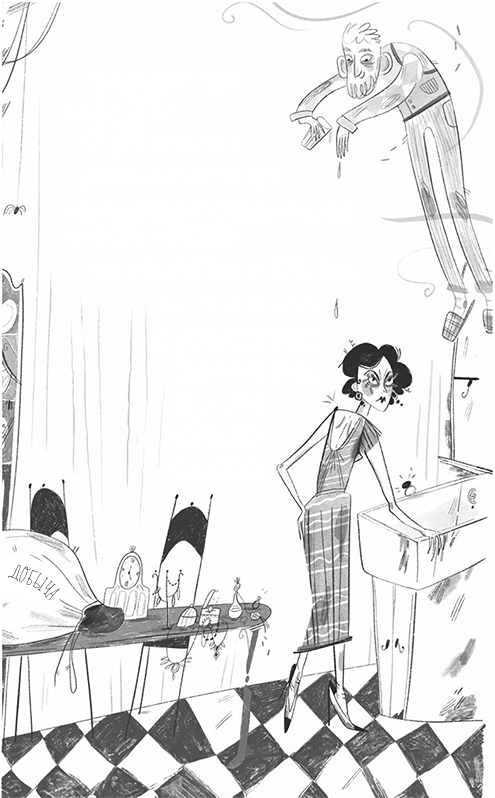Семейка вернулась, утомлённая утренней вредоносной деятельностью и нагруженная добычей. Водрузив на кухонный стол объёмистую сумку с наворованным добром, Ма склонилась над раковиной, полируя выточенный из лунного камня перстень. Сползшие чулки гармошкой собрались на тощих щиколотках, и её ноги выглядели точь-в-точь как морщинистые индюшачьи шеи. Она то и дело подскакивала и поёживалась, пронзительно взвизгивая, когда ей на спину падали капли ледяной воды.