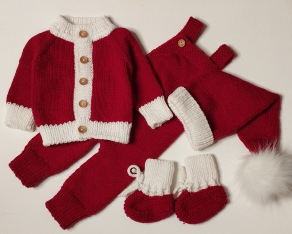 45 ряд: кромочная, 2 лицевых, накид, две вместе лицевой, 2 лицевых – (пряжа белого цвета), 79 лицевых (пряжа красного цвета), 6 лицевых, 1 изнаночная (пряжа белого цвета) (рост 68 см)