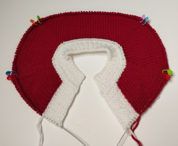 39 ряд: кромочная, 2 лицевых, накид, две вместе лицевой, 2 лицевых – (пряжа белого цвета), 79 лицевых (пряжа красного цвета), 6 лицевых, 1 изнаночная (пряжа белого цвета) (рост 62 см)