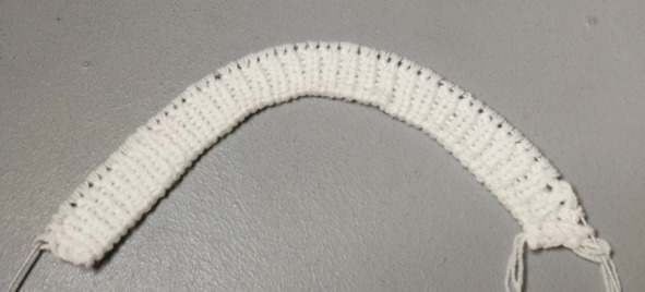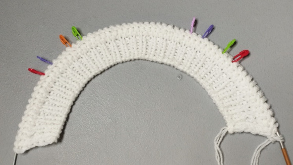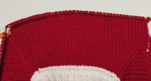 25 ряд: кромочная, 2 лицевых, накид, две вместе лицевой, 2 лицевых – (пряжа белого цвета), 79 лицевых (пряжа красного цвета), 6 лицевых, 1 изнаночная (пряжа белого цвета) (рост 62 см)