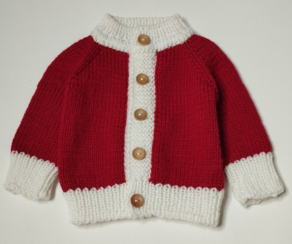 29 ряд: кромочная, 2 лицевых, накид, две вместе лицевой, 2 лицевых – (пряжа белого цвета), 79 лицевых (пряжа красного цвета), 6 лицевых, 1 изнаночная (пряжа белого цвета) (рост 68 см)