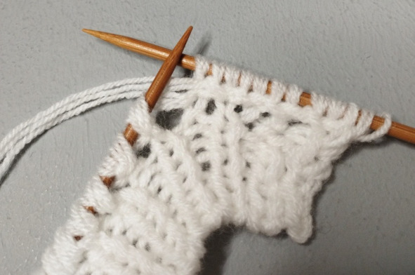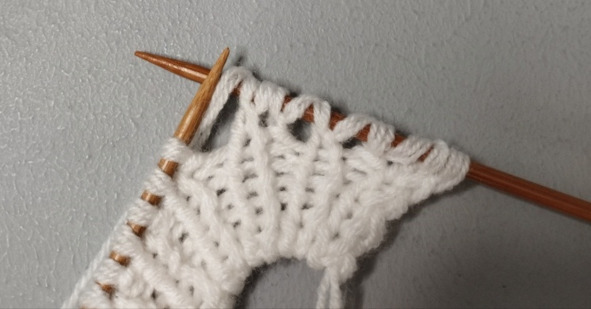 5 ряд: кромочная, 1 лицевая, 1 изнаночная, накид, две вместе лицевой, (1 лицевая, 1 изнаночная) – повторить 28 раз