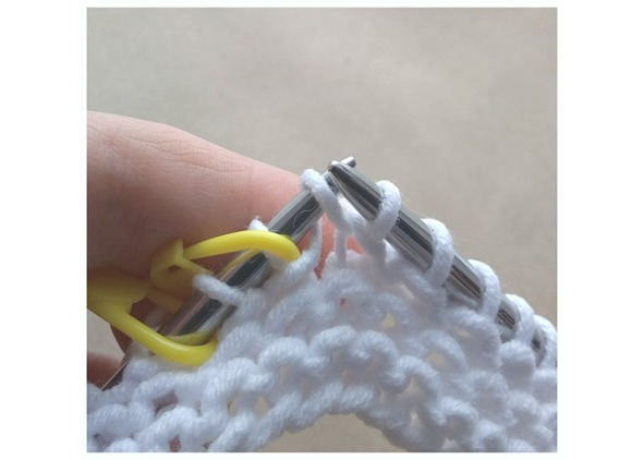 16 ряд: кромочная, 6 лицевых – (пряжа белого цвета), 111 изнаночных – (пряжа красного цвета), 6 лицевых, 1 изнаночная – (пряжа белого цвета) (125 петель)