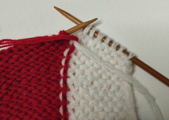 4 ряд: кромочная, 6 лицевых – (пряжа белого цвета), 63 изнаночных – (пряжа красного цвета), 6 лицевых, 1 изнаночная – (пряжа белого цвета) (77 петель)