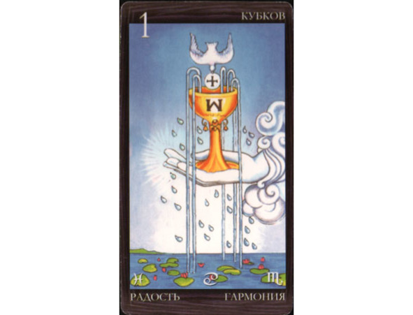 На карте изображена рука, выходящая из облака и держащая золотой кубок. Из кубка вырываются пять струй воды, что символизирует богатство эмоций и интуиции. Вокруг кубка изображены водяные лилии, подчёркивающие связь с эмоциями и подсознанием. Туз Кубков