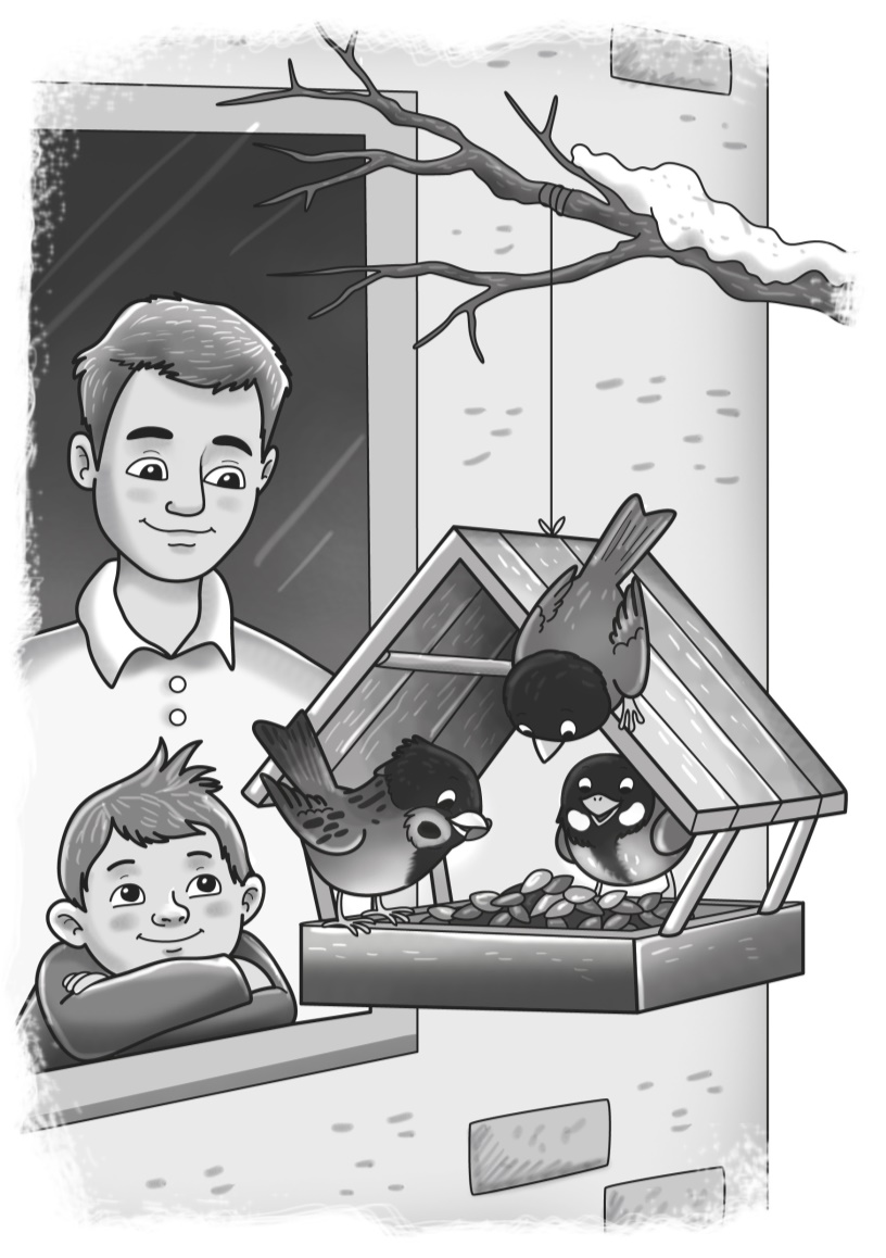 Вчера не играл я с любимой игрушкой.Весь день мастерили мы с папой кормушку.Повесили сразу её за окошко.Решили мы птиц покормить хоть немножко.Насыпал в кормушку я семечек горсти.Хочу, чтоб скорее летели к нам гости.А вот воробей и ещё две синички:Смешные, весёлые, шустрые птички.Так быстро склевали свой зимний обед…Смотрю на кормушку, а семечек нет!