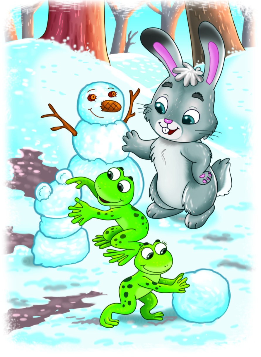 Фомка взял комочек снега, примял его лапой и положил на землю. Отталкиваясь лапами, он начал лепить снеговика. Скатал сначала низ, потом серединку, потом верхний шар. Лягушата с интересом смотрели на зайца, потом принялись помогать ему: катают шары разные и друг на друга ставят. Ручки-веточки, глазки – шиповника ягоды приладили, а вместо носа – шишки еловые. Такие ладные снеговики получились!