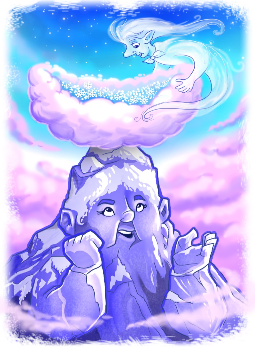 На вершине самой высокой горы северный ветер раскачивал огромное облако-колыбель. Он двигался медленно и осторожно, стараясь не потревожить спящий рой малюсеньких белых снежинок. Иногда ветер тихонько посвистывал, поскрипывал и покашливал, чем очень раздражал привыкшую к спокойному одиночеству гору. И вот однажды терпение у горы лопнуло, и она заговорила с ветром, который от неожиданности даже замер на мгновение.