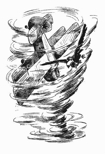 А смерч покружил еще немного на месте, затем резко сорвался, и полетел на юго-восток с огромной, прямо-таки фантастической скоростью. А маленький, в сравнении с ним конечно, кукурузник остался вертеться в самом его центре. Таким образом, уносил его смерч все дальше и дальше от родного дома. Сначала летел он над лесами, потом над степями, потом над горами, а потом, вы наверно уже и сами догадались, над морем, вернее над океаном.