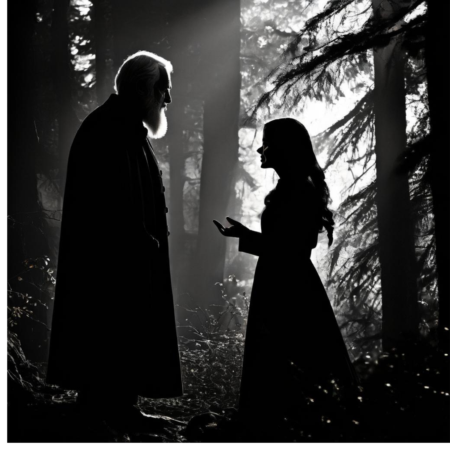 Тревога нарастала, когда вдруг раздался шорох листьев позади неё. Маша обернулась и, увидев старца, громко вскрикнула. Он стоял перед ней, облаченный в черную рясу, его седые волосы развевались на ветру. Старик опирался на ветку, которая служила ему костылём. Его лицо выражало мудрость и спокойствие, что немного успокоило Машу.
